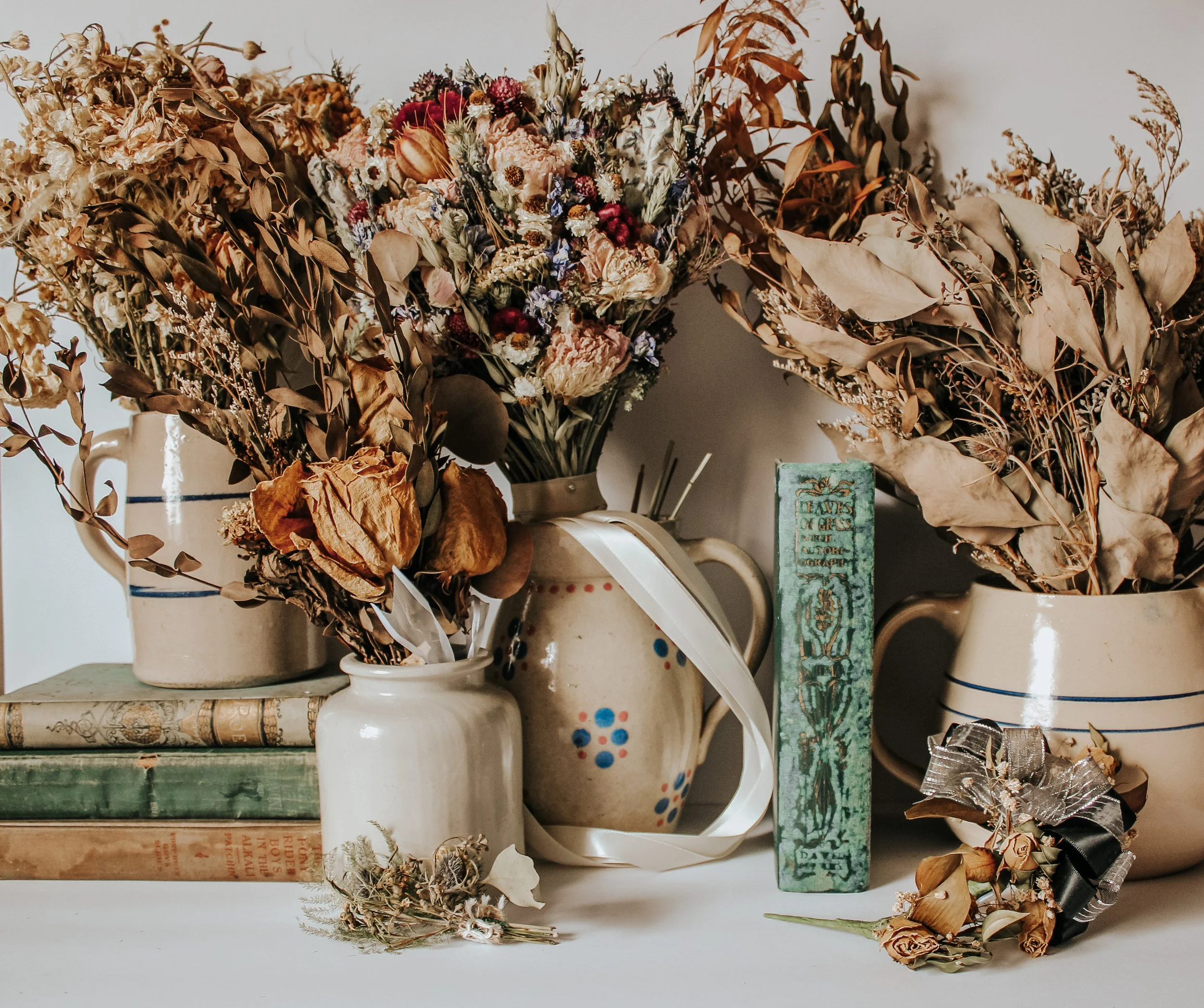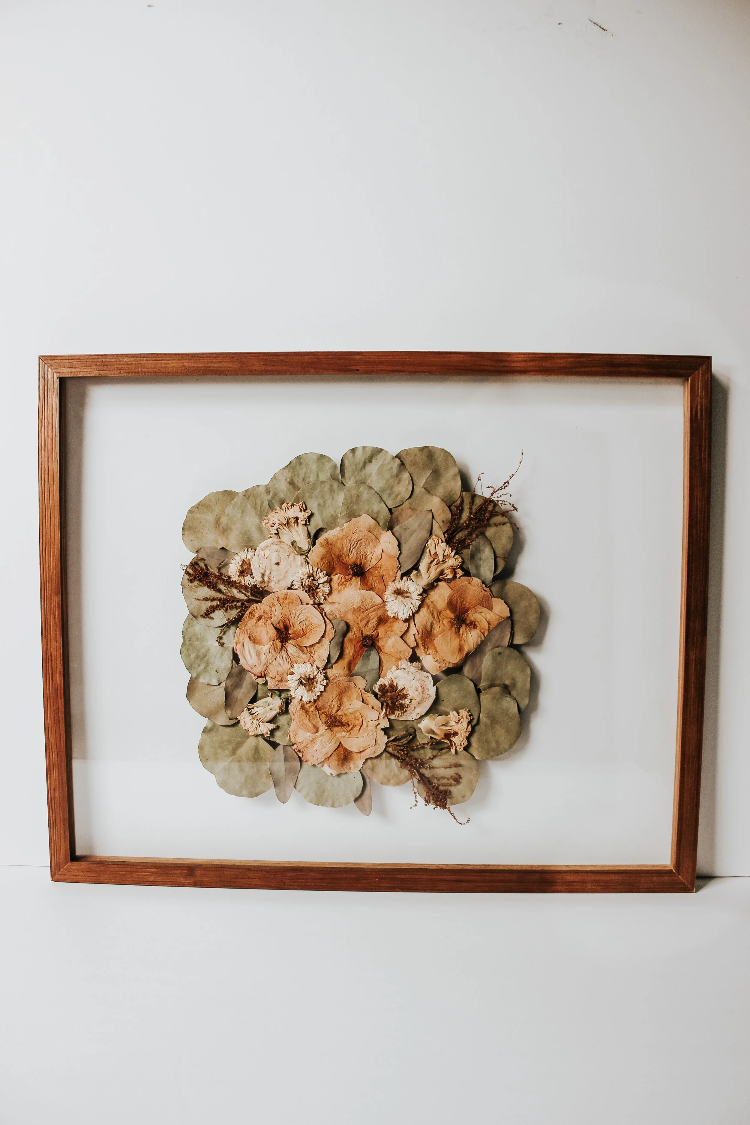 This Dried floral Gallery Includes some of the most precious, crunchy florals from all around the United States and some in the United Kingdom. Off of the dusty corner or shelf it has been sitting for years, Now Pressed and preserved perfectly in a Frame to enjoy forever. Most of these pieces are old Bridal florals ranging from 1 to 5 to even 10 years dried. Some are special funeral bundles and old Birthday florals.